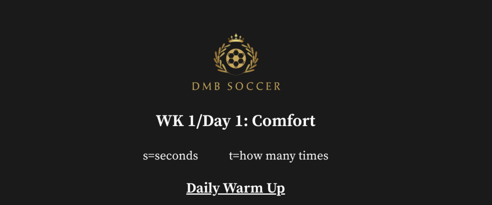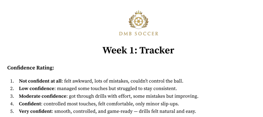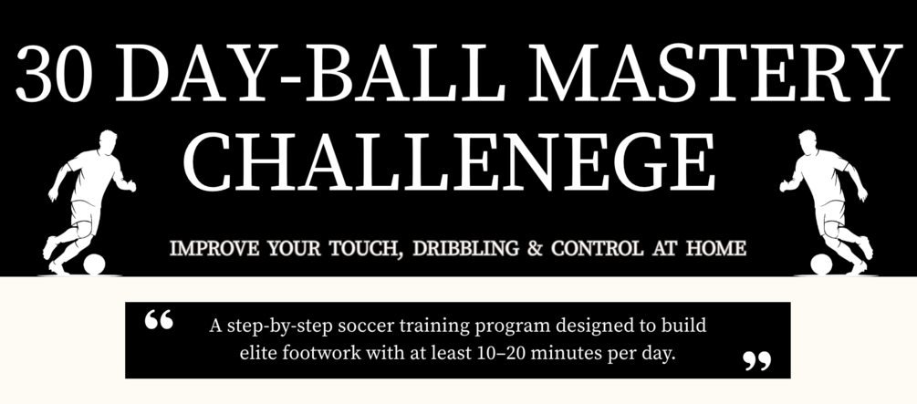 Week 1 Starter Challenge Kick off your ball mastery journey with the first 7 days of training. Inside this starter version, you’ll get: Daily drills designed to sharpen your touch and control Warm-ups to build rhythm and coordination before each session Interactive tracker to log progress and boost accountability Confidence-building challenges to test your skills by the end of the week This is the perfect way to try the program before committing to the full 30 days. By the end of Week 1, you’ll already feel sharper on the ball — and you’ll have the option to upgrade to the complete challenge to keep your momentum going.